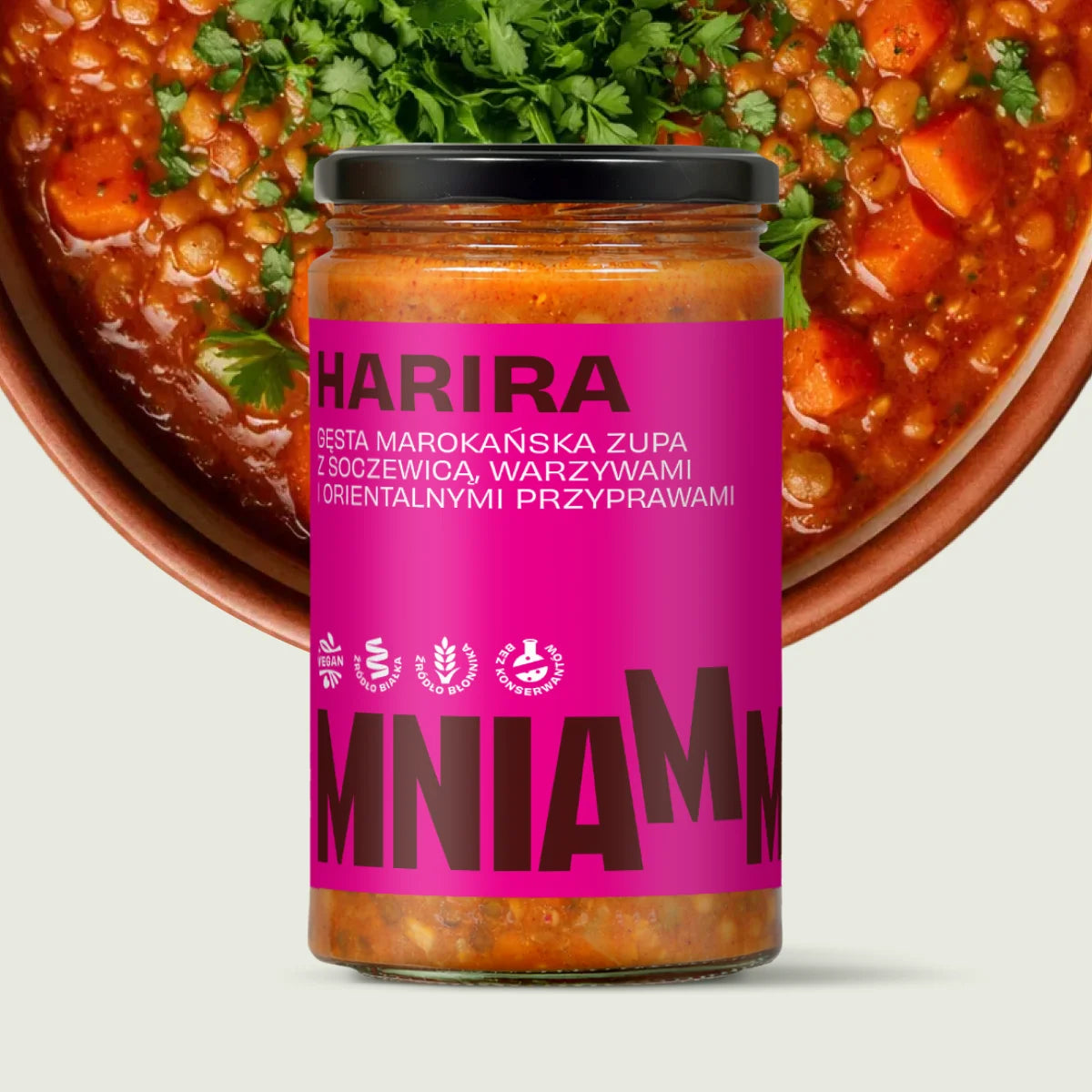 Nazwa wywodzi się od arabskiego słowa harir, czyli „jedwab”, i odnosi się do gładkiej, zawiesistej konsystencji zupy. Istnieje wiele lokalnych wersji, często opartych na baraninie, my jednak sięgnęliśmy po wegańską wariację inspirowaną Marrakeszem.